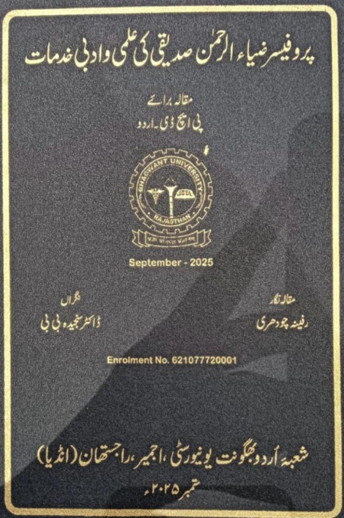 بہت کم ایسے ادیب ہیں جنکی زندگی میں انکی شخصیت اور ادبی خدمات پر کوئی اردو اسکالر تحقیقی مقالہ تحریر کرے۔یہ عزاز حاصل ہوا ہے امروہا کےفرزند پروفیسرضیاء الرحمن صدیقی کو۔ بھگونت یونیورسٹی اجمیر کےشعبۂ اردوکی اسکالررفینہ چودھری نے علی گڑھ مسلم یونیورسٹی کے شعبۂ اردو سے وابستہ محقق، نقّاد، مترجم اور صحافی ، پروفیسر ضیاء الرحمٰن صدیقی کی علمی و ادبی خدمات پرتحقیقی مقالہ تحریر کیا ہے۔ رفینہ چودھری نے یہ تحقیقی مقالہ ڈاکٹر سنجیدہ بی بی کی نگرانی میں لکھا جس پربھگونت یونیورسٹی اجمیر کےشعبۂ اردوکی جانب سے رفیفہ چودھری کو یکم دسمبر 2025 کو پی ایچ ڈی کی ڈگری تفویض کی گئی.