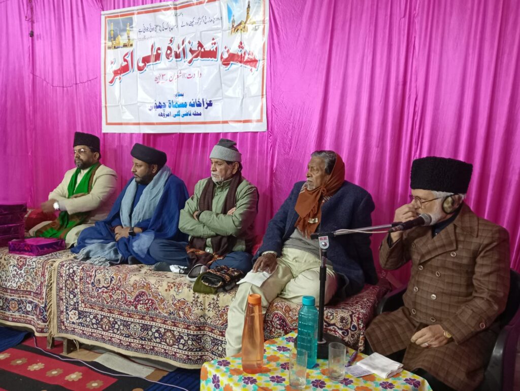 امام حسین کے فرزند ہم شبیہ پیغمبر جناب علی اکبر علیہ السلام کی ولادت کے موقع پر امروہا میں ‘جشن علی اکبر’ کے عنوان سے ایک طرحی محفل منقبت کا اہتمام کیا گیا۔ عزا خانہ مسماۃ چھجی میں منعقدہ اس محفل کی صدارت مولانا صفدر رضا امامی نے کی جبکہ مسند پر مولانا منظر عباس، استاد شاعر شان حیدر بے باک امروہوی اور نوشہ امروہوی بھی موجود تھے۔ محفل کی نظامت ہر سال کی طرح ڈاکٹر لاڈ لے رہبر نے کی۔