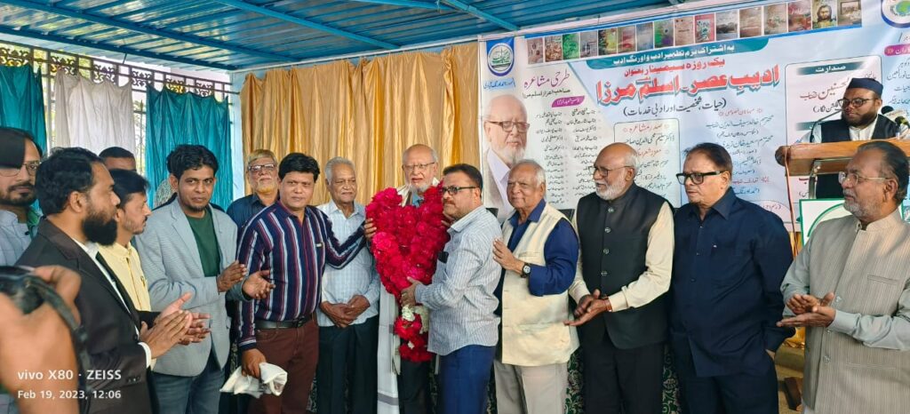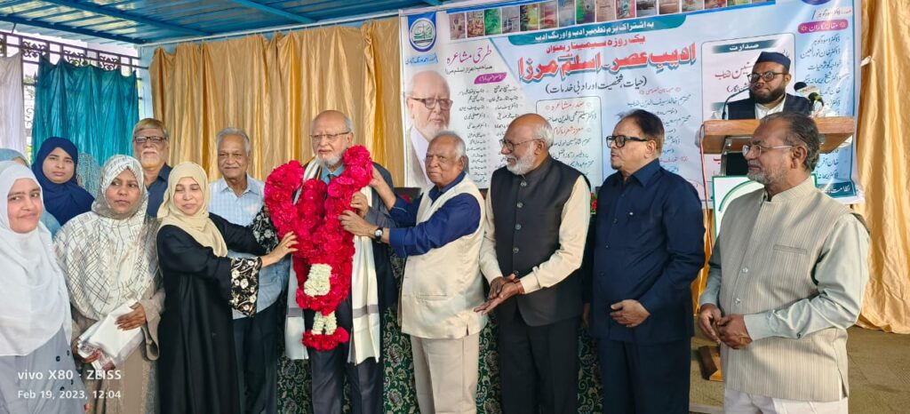 ساہتیہ اکاڈمی ایوارڈ یافتہ معروف ادیب و شاعر محترم اسلم مرزا کے اعزاز میں ایک شاندار یک روزہ سیمنار اور طرحی مشاعرہ کا اہتمام کیا گیا۔نوجوان قلم کاروں کی ادبی تنظیم اورنگِ ادب اور نسائی تنطیم بزم تطہیرِ ادب کے اشتراک سے یہ پروگرام عالمگیر ہال شاہی مسجد میں منعقد کیا گیا ۔ اس سیمِنار کی خاص بات یہ رہی کہ یہ مسلسل ۹ گھنٹے پورے جوش و خروش کے ساتھ چلتا رہا ۔ ادیب عصر اسلم مرزا کی حیات ،شخصیت اور ادبی خدمات کا احاطہ کرتے ہوئے اس سیمِنار میں اورنگ آباد سے تعلق رکھنے والے تقریباً 12 ابھرتے ہوئے قلم کاروں نے اپنے مقالے پیش کئے اور 30 سے زائد مقامی و مہمان شعراء و شاعرات نے اسلم مرزا کی غزلوں کے مصرعوں پر خوبصورت و طرحی غزلیں پیش کرکے سامعین سے داد و تحسین حاصل کی۔پہلے سیشن کی صدارت ملک کے معروف فکشن نگار نورالحسنین نے کی تو مہمانانِ خصوصی کے طور پر ڈاکٹر مخدوم فاروقی ، خالد سیف الدین ، سعید خان زیدی ،ڈاکٹر عظیم راہی موجود تھے ۔صاحبِ اعزاز کا تعارف اونگِ ادب کے صدر احمدؔ اورنگ آبادی نےپیش کیا۔
