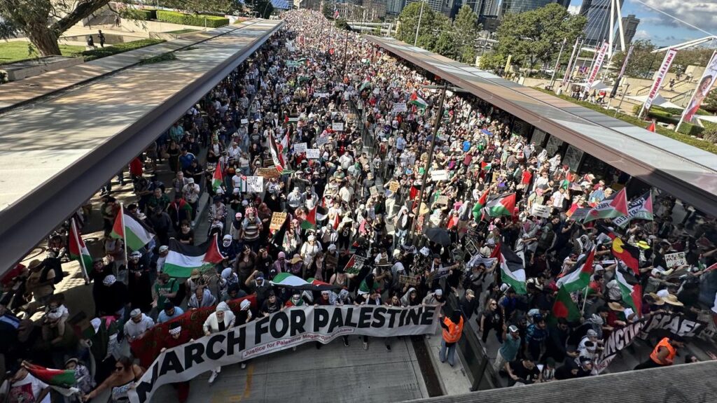 آسٹریلیا کے مختلف شہروں میں اتوار کے روز لاکھوں افراد فلسطین کے حق میں سڑکوں پر نکل آئے۔ صرف سڈنی، ملبورن اور بریزبن سمیت مختلف شہروں میں 3 لاکھ 50 ہزار سے زائد مظاہرین نے اسرائیلی جارحیت کے خلاف اور فلسطین کی آزادی کے حق میں آواز بلند کی۔