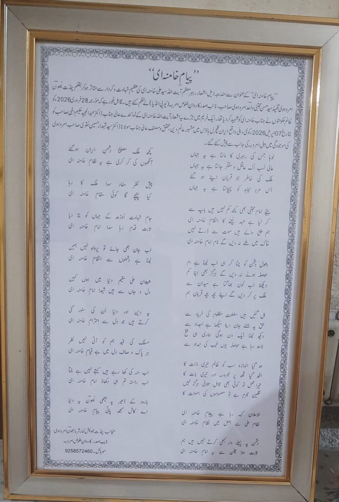 مداح اہل بیت بھونیش کمار شرما نے کہا کہ شہید خامنہ ای کی شہادت کا اثر صرف مسلمانوں ہی پر نہیں ہے بلکہ ہندو بھی ان کی شہادت پر غمزدہ ہیں۔ بھون شرما نےرھبر کی شہادت سے متاثر ہوکر کہی گئی تعزیتی نظم بھی ڈاکٹر حکیم الھی کی خدمت میں پیش کی ۔انہوں نے اپنا نعتیہ اور منقبتی مجموعہ اور امروہا کی عظیم شخصیات پر لکھی اپنی کتاب بھی ڈاکٹر حکیم الھی کو پیش کی۔