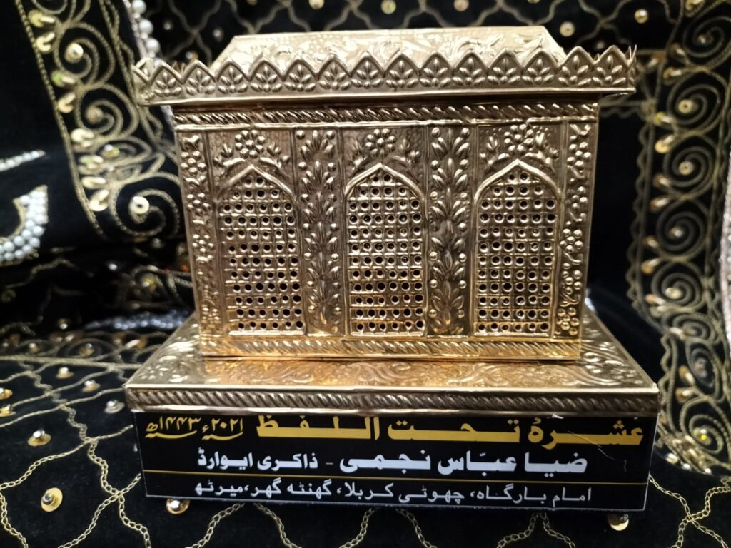 عزا خانہ چھوٹی کربلا میں یہ عشرہ تحت اللفظ مجالس گزشتہ2009 سے جاری ہے۔ اس پہلے عشرے کا ذاکری ایوارڈ مرحوم محمد ارتضی کے حصے میں آیا تھا۔ اس خصوصی عشرےکی روایت کے مطابق ذاکری ایوارڈ جس شخصیت کے نام سے منسوب کیا جاتا ہے اسکا نام ہر برس تبدیل ہوتا رہتا ہے لیکن پیش خوانی ،سوز خوانی اور سامعین ایوارڈ جن ہستیوں کے نام منسوب ہیں ان میں تبدیلی نہیں آتی ہے۔ اس برس کا ذاکری ایوارڈ مرحوم ذاکر اور شاعر اہل بیت ضیا عباس نجمی امروہوی کے نا م سے منسوب کیا گیا۔ جو اس عشرہ مجالس میں ہر برس مرثیہ پیش کرتے تھے۔ ضیا عباس نجمی کا انتقال گزشتہ سات جولائی کو مختصر علالت کے بعد امروہا میں ہوگیا تھا۔ ضیا عباس نجمی کے فرزند شجاع عباس نے اس عشرے کی پانچویں مجلس میں مرثیہ پیش کیا۔