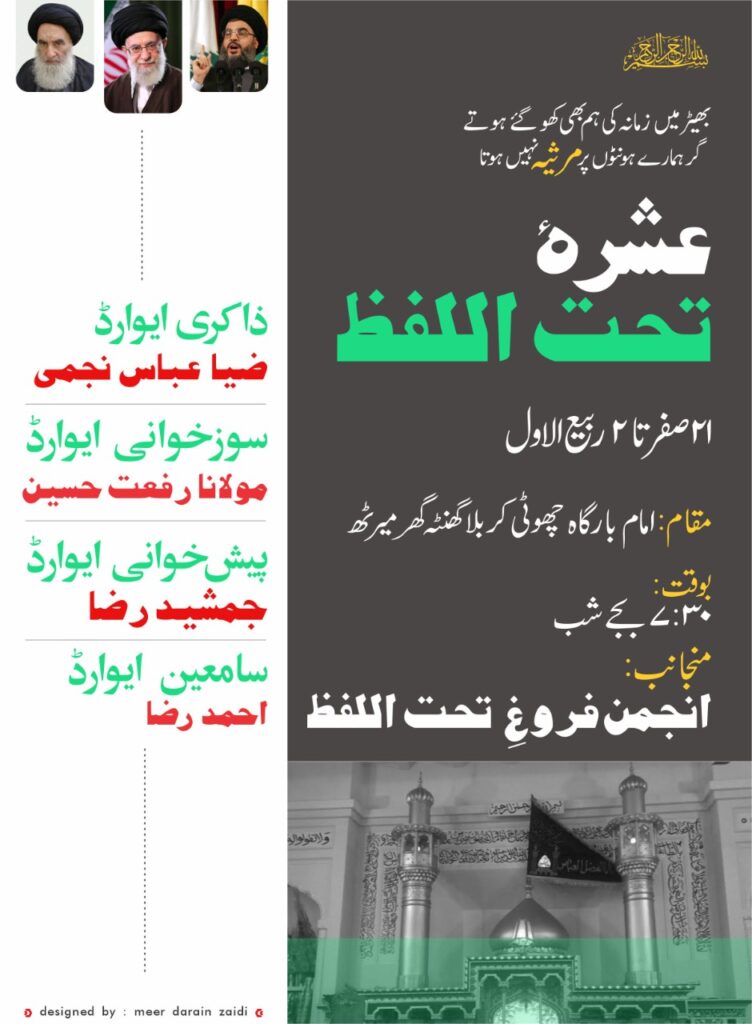 اس عشرہ مجالس میں صفدر رضوی ، حسن زیدی، نوید فراز،غضنفر عباس شجاع عباس، فخری میرٹھی، عباس مرتضیٰ، انور ظہیر میرٹھی، اعجاز علی اور حسنین رضا امروہوی نے تحت اللفظ مرثیے پیش کئے۔ ۔ سوز خوانی، ضیا زیدی،علی زیدی، رضا جلالوی، رضی الحسنین،دانش،فیصل، فیروز،سہیل کاظمی،دانش،زاہد مہلکوی اور دارین حسین اور انکے ہمنواؤں نے کی اور محمد حسین،محمد رضا،عون، وارث رضا،دبیر آغا،علی ادیب،علی قنبر،مجتبیٰ،عابد جعفری،مصطفیٰ اورمحمد میاں نے پیش خوانی کی۔